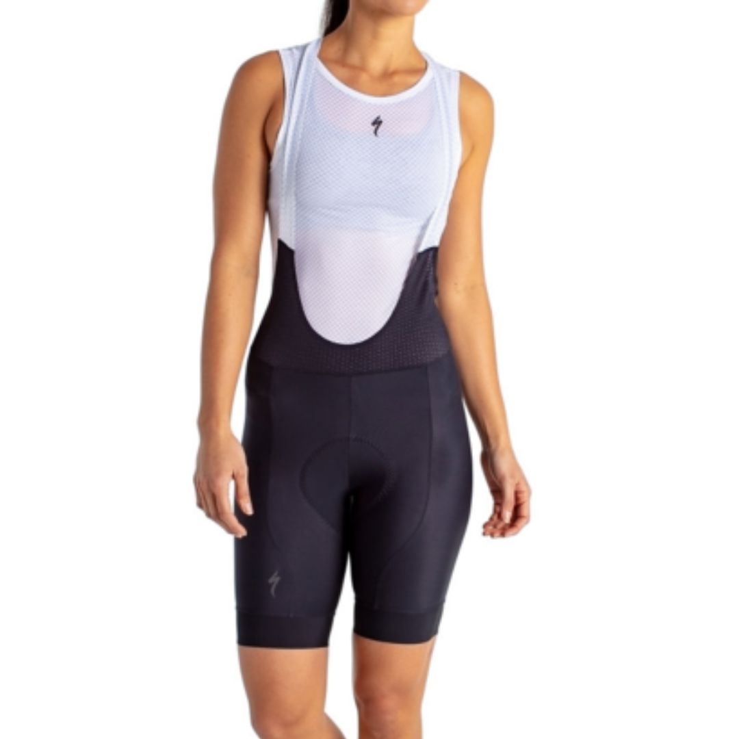 Both are made of stretchy material and include a chamois (the pad that allows you to sit comfortably on your saddle). However, bibs are equipped with suspender-like straps and often go higher up the stomach and back than the standard short. The advantage of a bib is that they usually keep the chamois right where it needs to be. They also don't dig into your stomach when you're riding because there's no waistband. Bibs also don't need to be continually adjusted and pulled up like shorts might due to the shoulder straps.